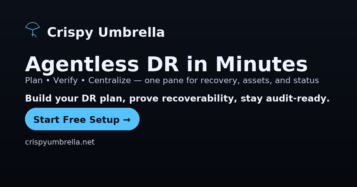Get weekly tips, compliance checklists, and product updates delivered to your inbox. Join IT professionals who trust Crispy Umbrella for their DR needs.