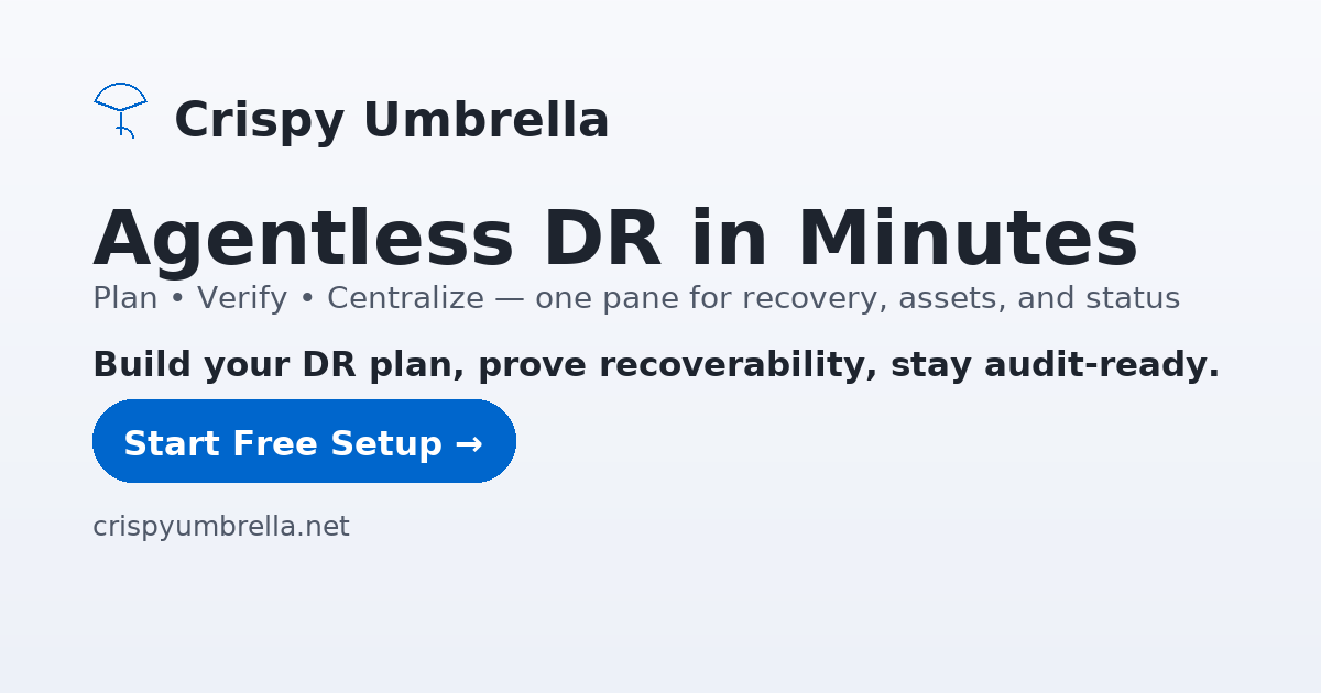 Get weekly tips, compliance checklists, and product updates delivered to your inbox. Join IT professionals who trust Crispy Umbrella for their DR needs.